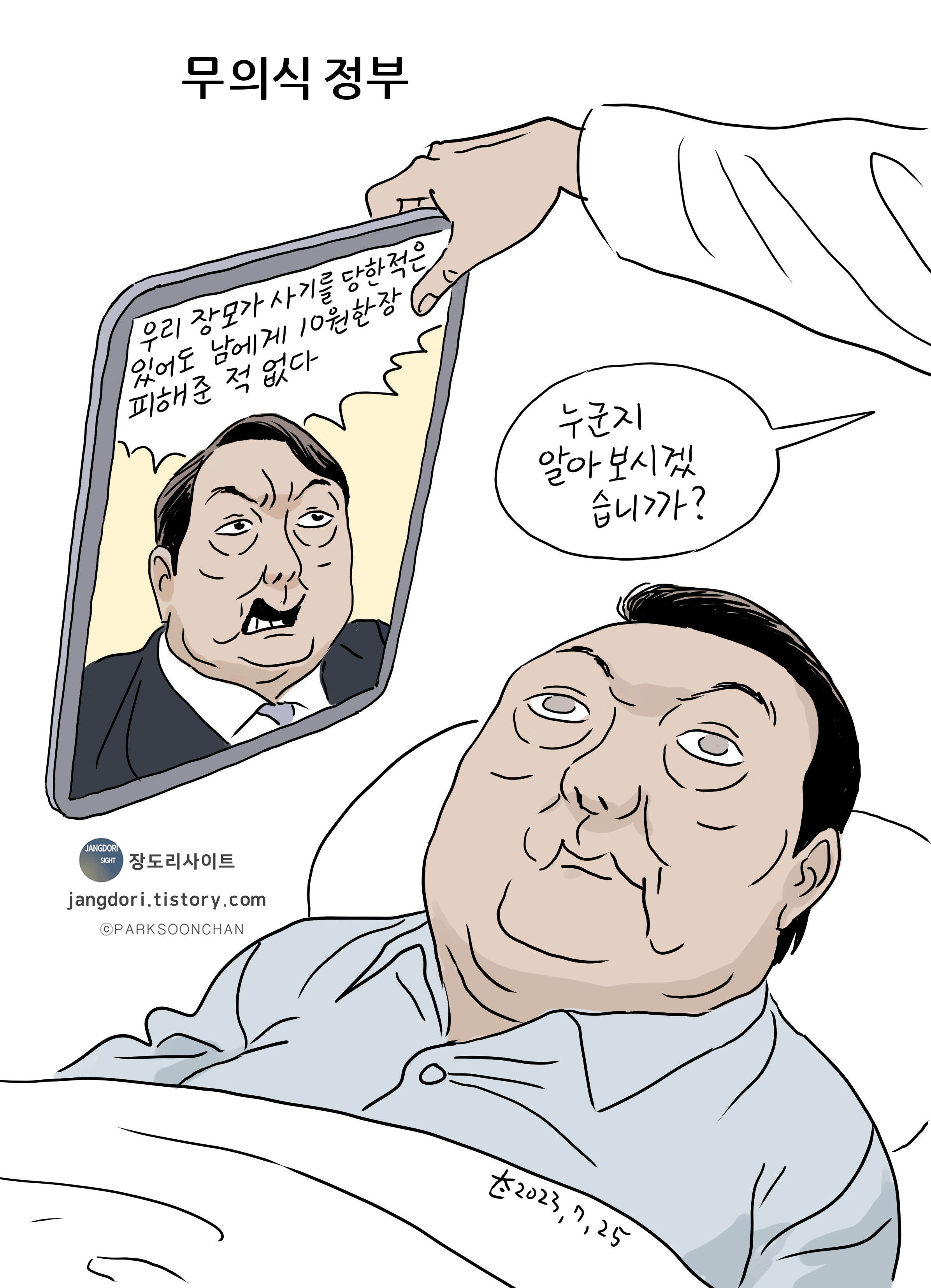 만화 <무의식정부> by 박순찬 2023. 7. 25. 반응형 윤석열 대통령의 장모 최은순씨가 349억 원의 은행 잔고증명서를 위조한 혐의로 징역 1년 형을 받고 법정구속됐다.대통령의 장모가 구속된 초유의 사건에 대해 대통령실은 "사법부 판단에 왈가왈부 하지 않겠다"라며 사과발언 하나 없이 묵묵부답이다.게다가 반복되는 대형참사와 정부의 무능한 대처에 대해 지금이 무정부 상태와도 같다는 시민들의 분노에도 정부는 사과 한마디 하지 않고 있으니 과연 현 정부는 어떤 의식상태인지 진단이 필요한 형편이다. 공유하기 게시글 관리 장도리 사이트 저작자표시 비영리 변경금지 (새창열림) '만화' 카테고리의 다른 글 <휘발공화국> (4) 2023.08.01 <스승과 제자> (4) 2023.07.28 <카르텔> (6) 2023.07.21 <무정부라니?> (8) 2023.07.18 <윤석열차> (7) 2023.07.14 관련글 <휘발공화국> <스승과 제자> <카르텔> <무정부라니?> 댓글