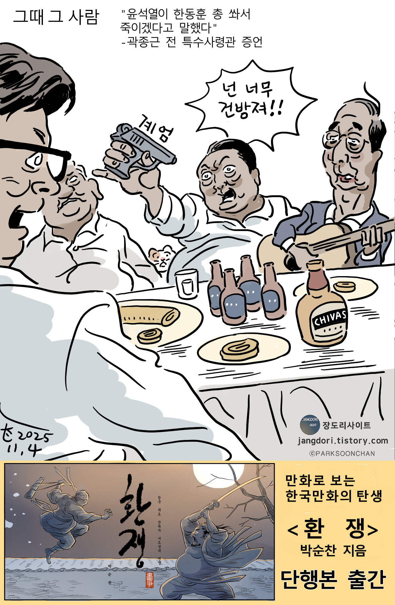 만화 <그때 그 사람> by 박순찬 2025. 11. 4. 반응형 윤석열 전 대통령이 한동훈 전 국민의힘 대표 등을 직접 총으로 쏴서라도 죽이겠다는 발언을 했다고 곽종근 전 특수전사령관이 내란 혐의 사건 재판에 출석해 증언했다.2024년 10월부터 윤 전 대통령이 비상대권을 언급했다고 증언해온 곽 전 사령관이 윤 전 대통령의 발뺌을 보다못해 결국 내란을 입증할 만한 구체적 발언을 증언하게 된 것이다.자신의 책임을 회피하고 부하 탓으로 돌리는 윤 씨에게는 생생한 증언들만 기다리고 있을 뿐이다. 공유하기 게시글 관리 장도리 사이트 저작자표시 비영리 변경금지 (새창열림) '만화' 카테고리의 다른 글 <기우제> (2) 2025.11.07 <멸콩의 배신> (1) 2025.11.05 <MCGA> (2) 2025.11.01 <국정감사의 왕> (2) 2025.10.31 <타이타닉> (3) 2025.10.29 관련글 <기우제> <멸콩의 배신> <MCGA> <국정감사의 왕> 댓글